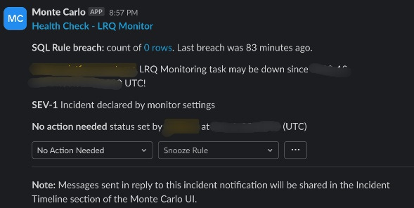 We then setup another Monte Carlo custom SQL monitor to run every 15 minutes and check for an entry in the SQM_STATUS table with status=SUCCESS. Any instances where no results are returned are reported to the Slack channel as a possible health issue with Snowguard.