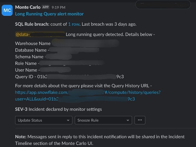 This alert is equipped with not just the query metadata details such as database, schema, and warehouse, but also the query history URL which enabled the teams to view the flagged query in just a single click.